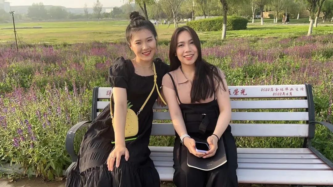 老挝籍留学生刘娅兰(右一)在大医校园拍摄《我的外国闺蜜》