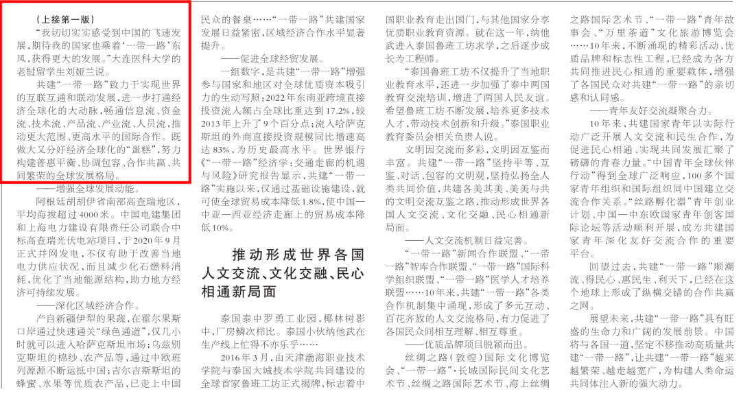 今年是“一带一路”倡议提出的十周年。过去的十年间,我国同各国加强政策沟通、设施联通、贸易畅通、资金融通、民心相通,筑就了一条和平之路、繁荣之路、开放之路、绿色之路、创新之路、文明之路,不断实现各国人民对文明交流的渴望、对和平安宁的期盼、对共同发展的追求、对美好生活的向往。
