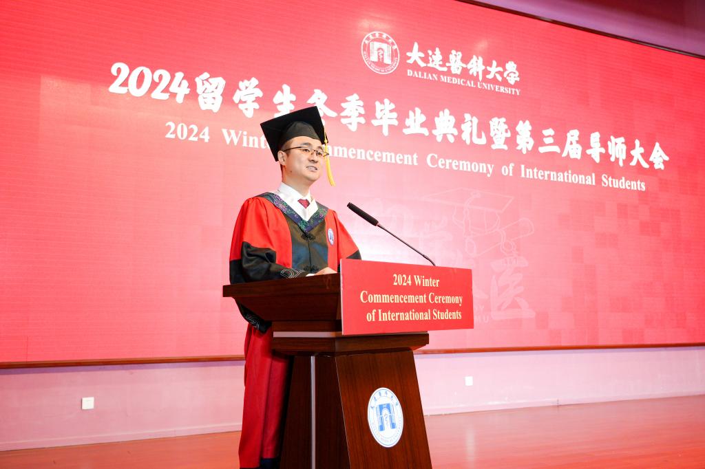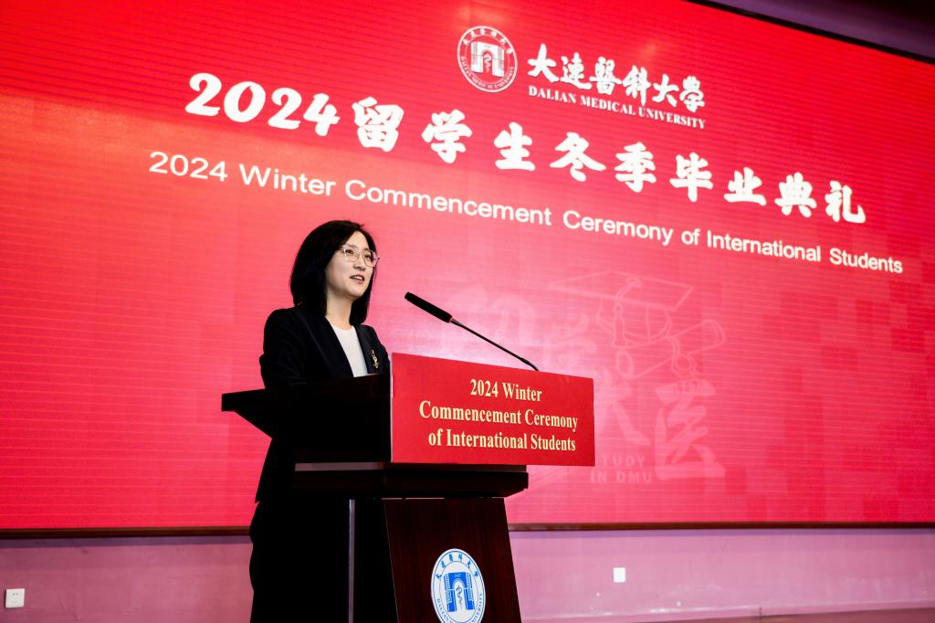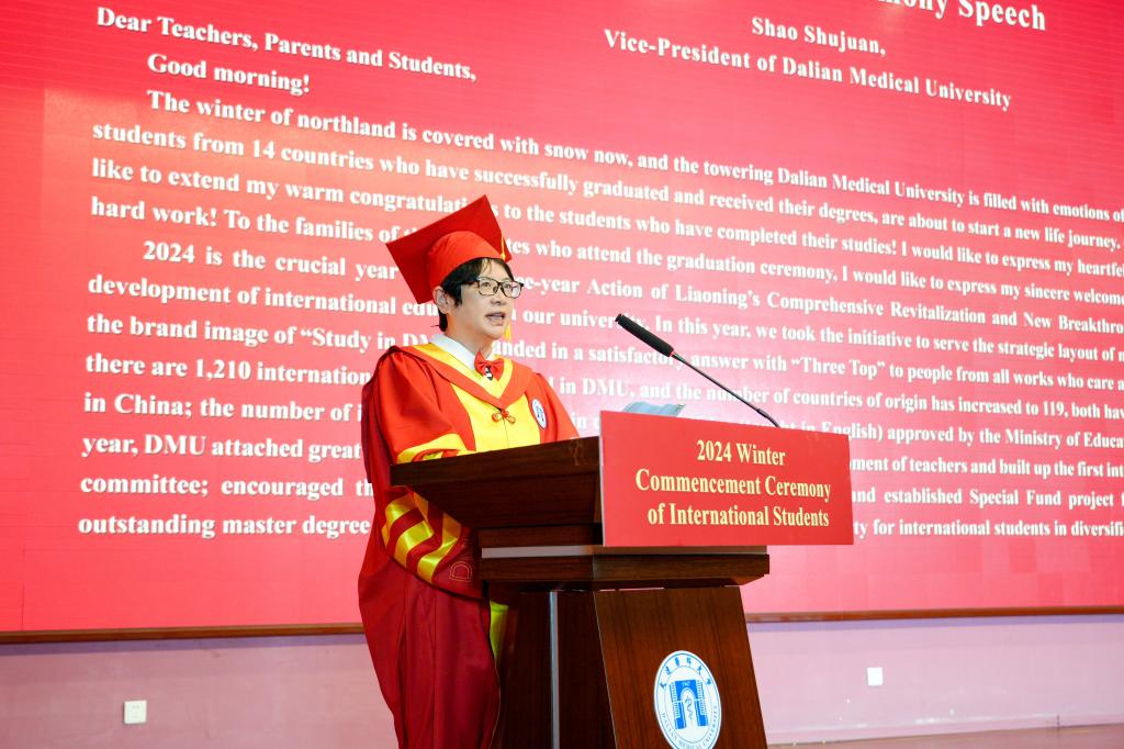 副校长邵淑娟致辞,她代表学校对来自14个国家的84名国际学生顺利完成学业表示热烈祝贺并表达了殷切期望:“明仁、济世”,践行医者仁心的光荣使命;“甚解、敏行”,提升妙手丹心的精湛技艺;“开放、交流”,推动构建人类命运共同体。
