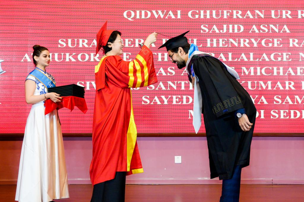 随后,院长卢苇宣读《2024届冬季国际学生学位授予决定》,校长刘莹分别为博士研究生、硕士研究生、本科毕业生拨穗并颁发毕业证书。