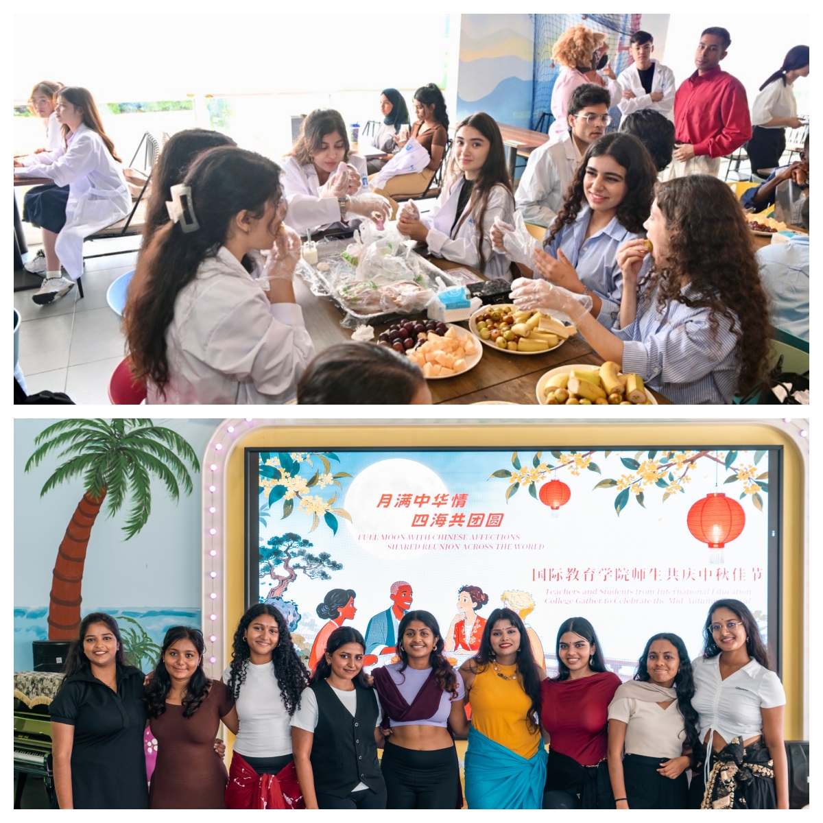 节目表演结束后,活动进入温馨的茶话会环节。现场摆放了各色月饼、新鲜水果等节令食品,师生围坐在一起,一边品尝美食,一边畅谈生活与学习中的趣事。大家用中文、英文以及各自的母语交流着对中秋的感受,分享着家乡的节日习俗,在轻松愉快的氛围中,进一步拉近了彼此的距离。活动最后,全体师生共同拍摄“中秋全家福”,镜头定格下一张张灿烂的笑脸,也记录下这场跨越国界的团圆时刻,为此次中秋活动留下了珍贵的回忆。