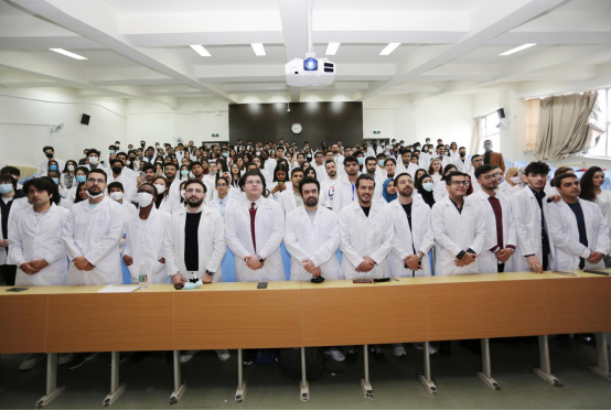 最后,由两名学生代表领誓,全体学生身着白大褂,许下他们身为医学生的誓言。
